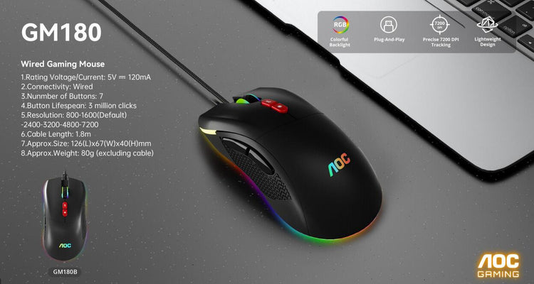 1. 额定电压/电流:5V - 120mA 2.连接方式:有线 3.按钮数量:7 4. 按钮寿命:300万次点击 5.分辨率:800-1600(默认)-2400-3200-4800-7200 6.电缆长度:1.8米。 7.大约尺寸:126(长)x67(宽)x40(高)毫米 8. 约重:80克(不含电缆)